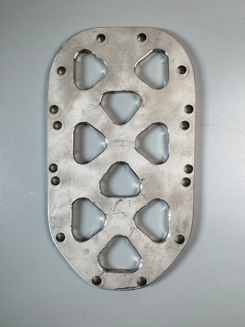 Heavy-duty leverage plate designed for Harley-Davidson FLSTC models. Features stainless steel construction with strategically positioned triangle holes for secure tool leverage and access. Uses original mounting screws for seamless installation. Made in the USA.